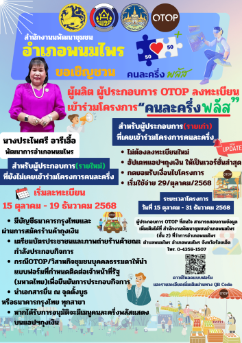 เชิญชวนผู้ผลิต ผู้ประกอบการ OTOP อำเภอพนมไพร เข้าร่วมโครงการ คนละครึ่ง พลัส